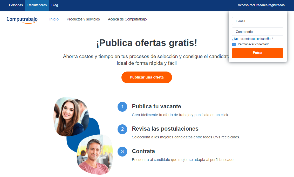 Una vez dentro de la sección de "Reclutadores ¡Publica ofertas gratis!", puedes acceder a través de "Acceso reclutadores registrados" con tu usuario y contraseña: