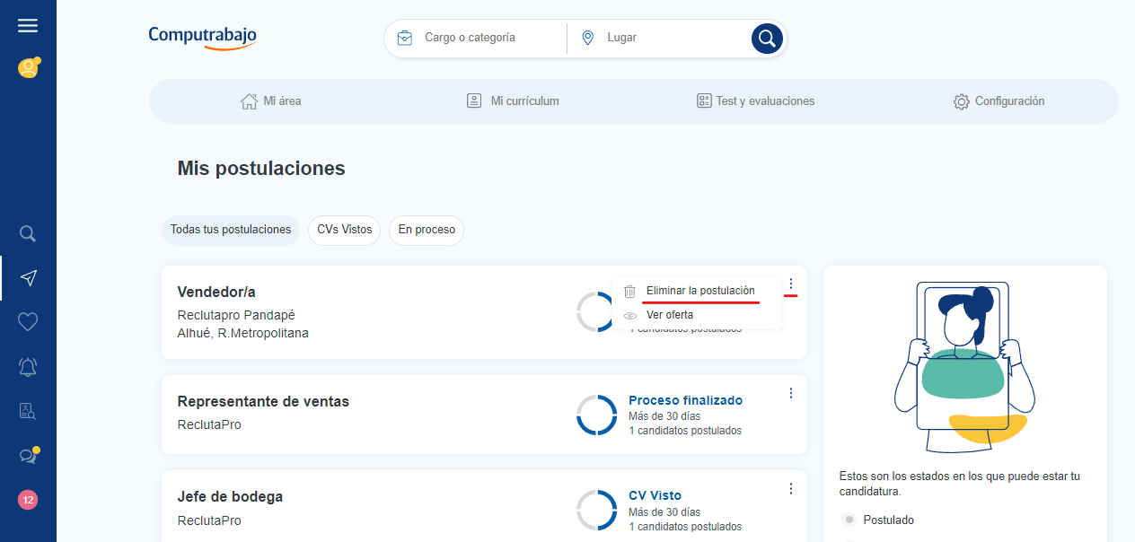 Recuerda que si eliminas una candidatura, no podrás volver a postularte a la misma oferta laboral.